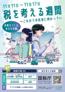 国税庁では、毎年11月11日から17日までの一週間を「税を考える週間」とし、この期間を中心に様々な広報活動を行うとともに税務行政に対するご意見やご要望をお寄せいただく機会としております。国税庁の取組事項の紹介ページはこちらですので、ご覧ください。