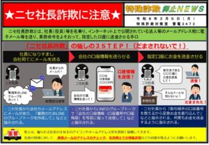HOME > お知らせ > ニセ社長詐欺にご注意ください 2026年2月20日 埼玉県警察特殊詐欺対策室より県内企業に対して会社の役員を騙った不審メール(ビジネスメール詐欺)が確認されている旨の注意喚起されています。詐欺の手口をまとめた資料をご確認の上、周知をお願いします。